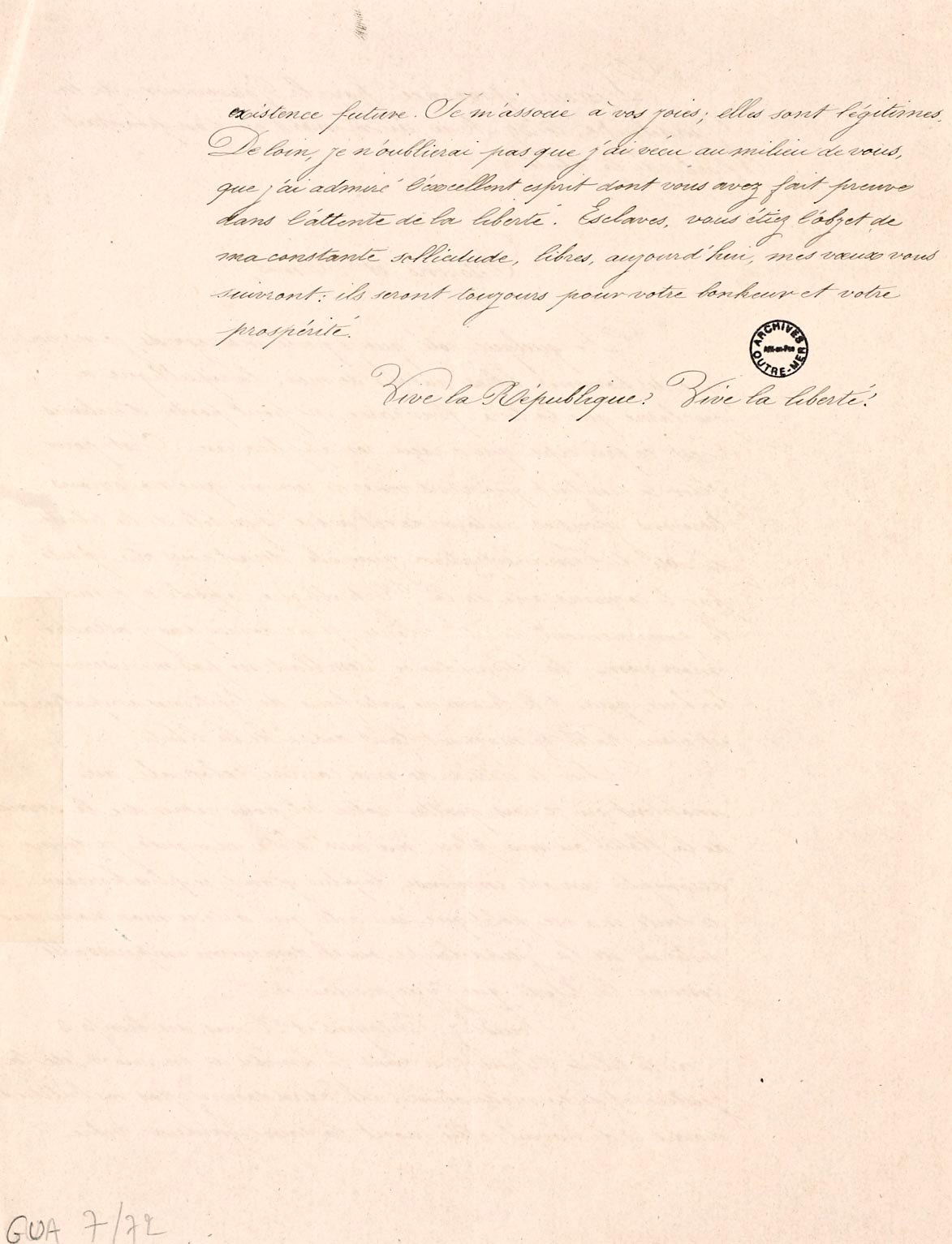 Discours de Layrle lors de la plantation de l’arbre de la liberté en Guadeloupe, 29 mai 1848. FR ANOM Série géographique Guadeloupe 7-72 (©ANOM)
