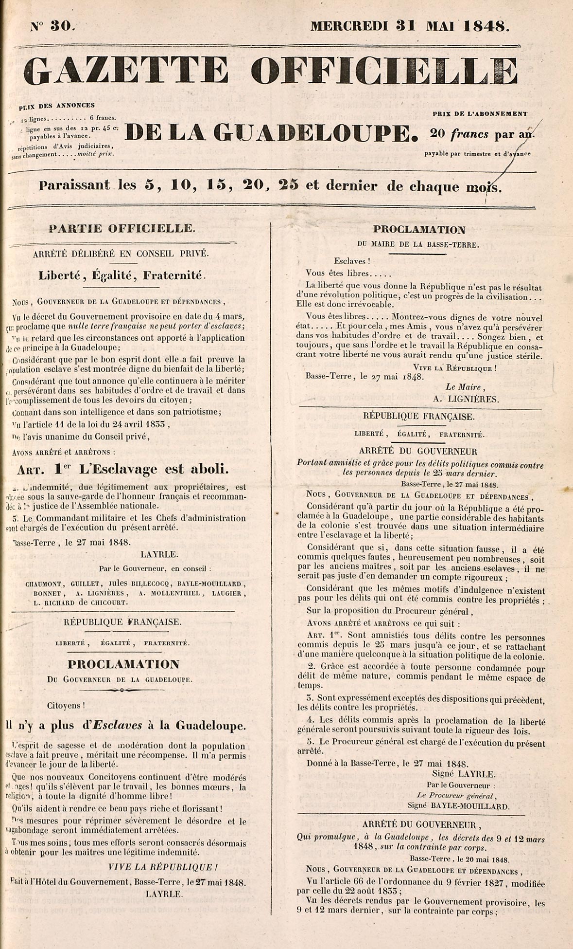 du 31 mai 1848, p. 1 en entier, « L’esclavage est aboli ».