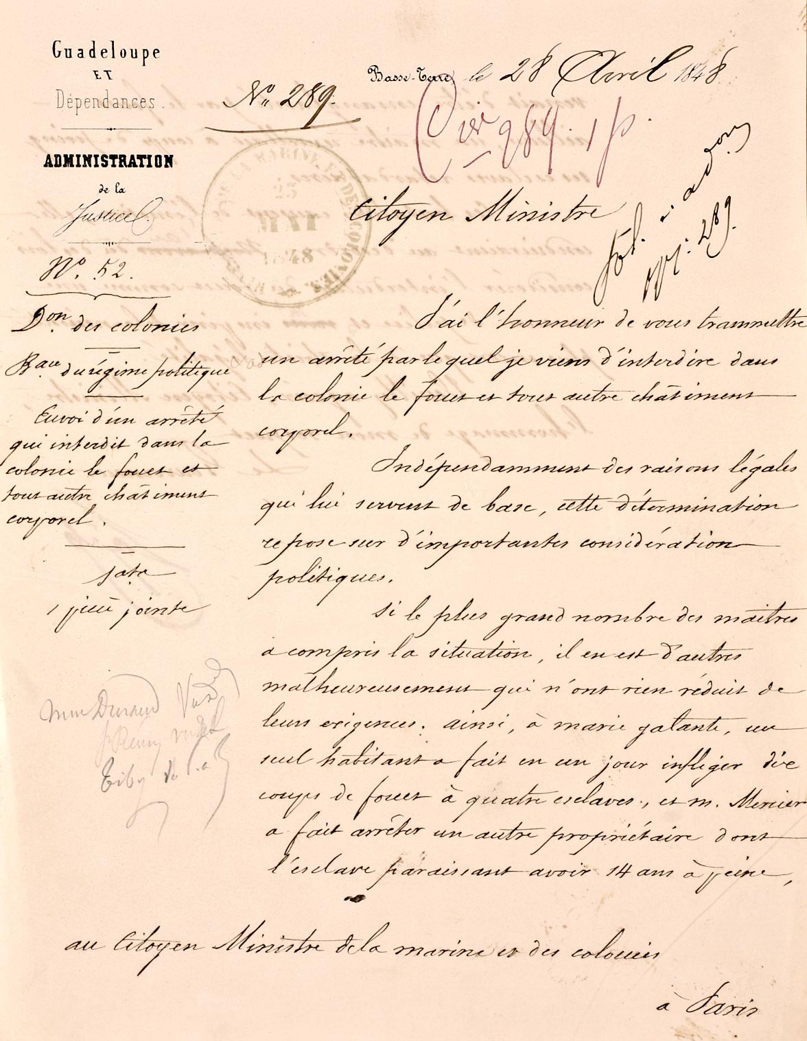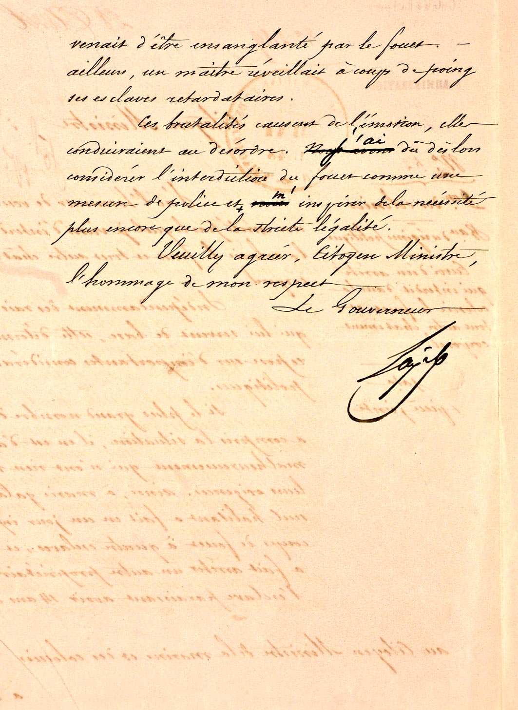 Arrêté du gouverneur de la Guadeloupe qui interdit le fouet.