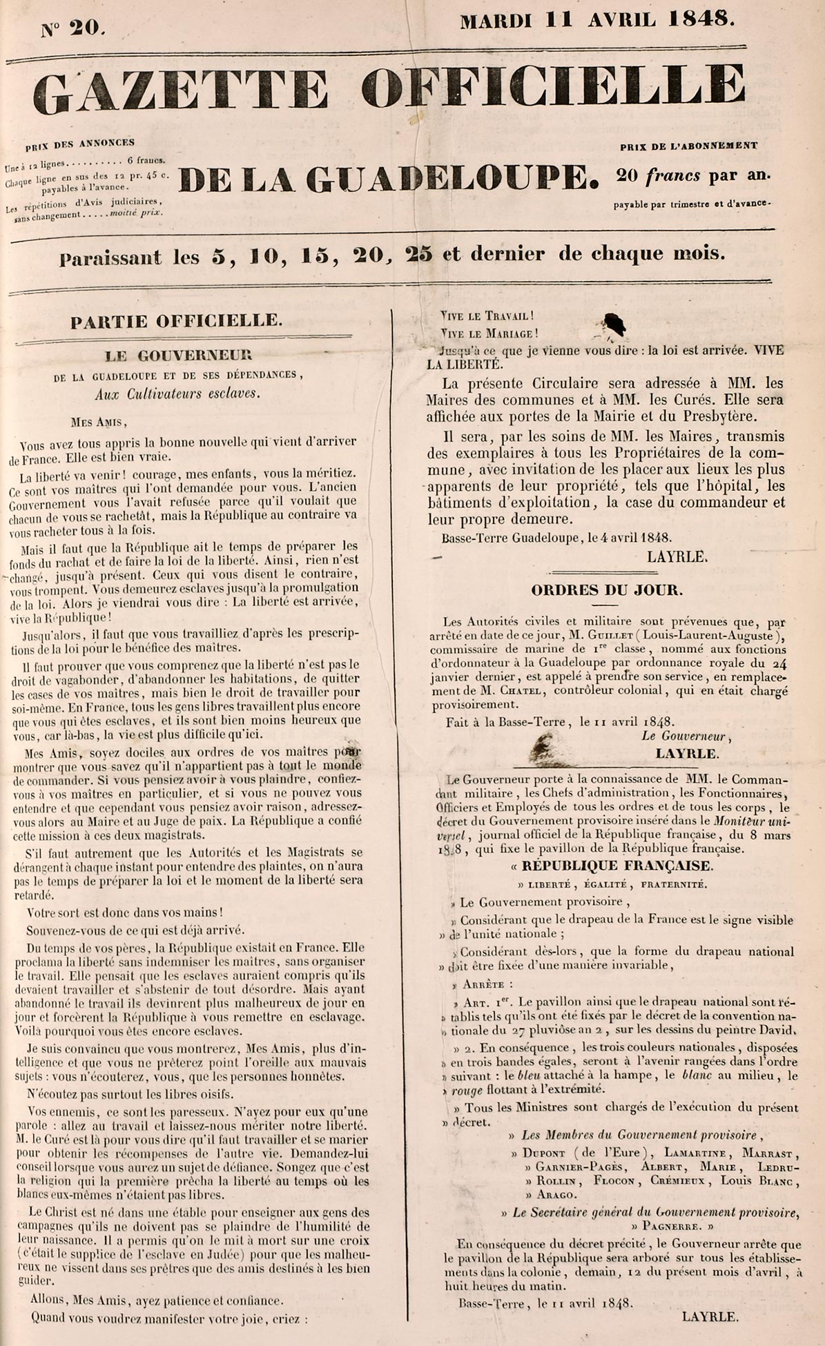 du 11 avril 1848 : p. 1 : Le gouverneur aux cultivateurs esclaves, 4 avril 1848.