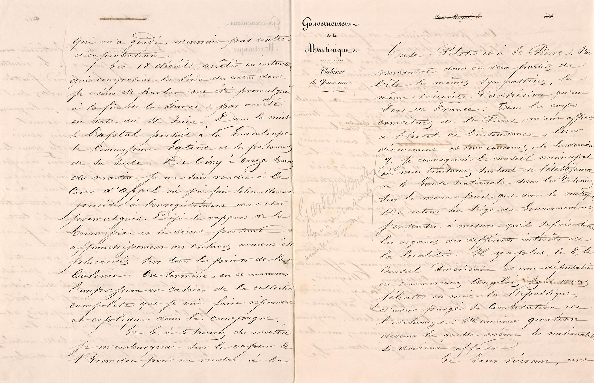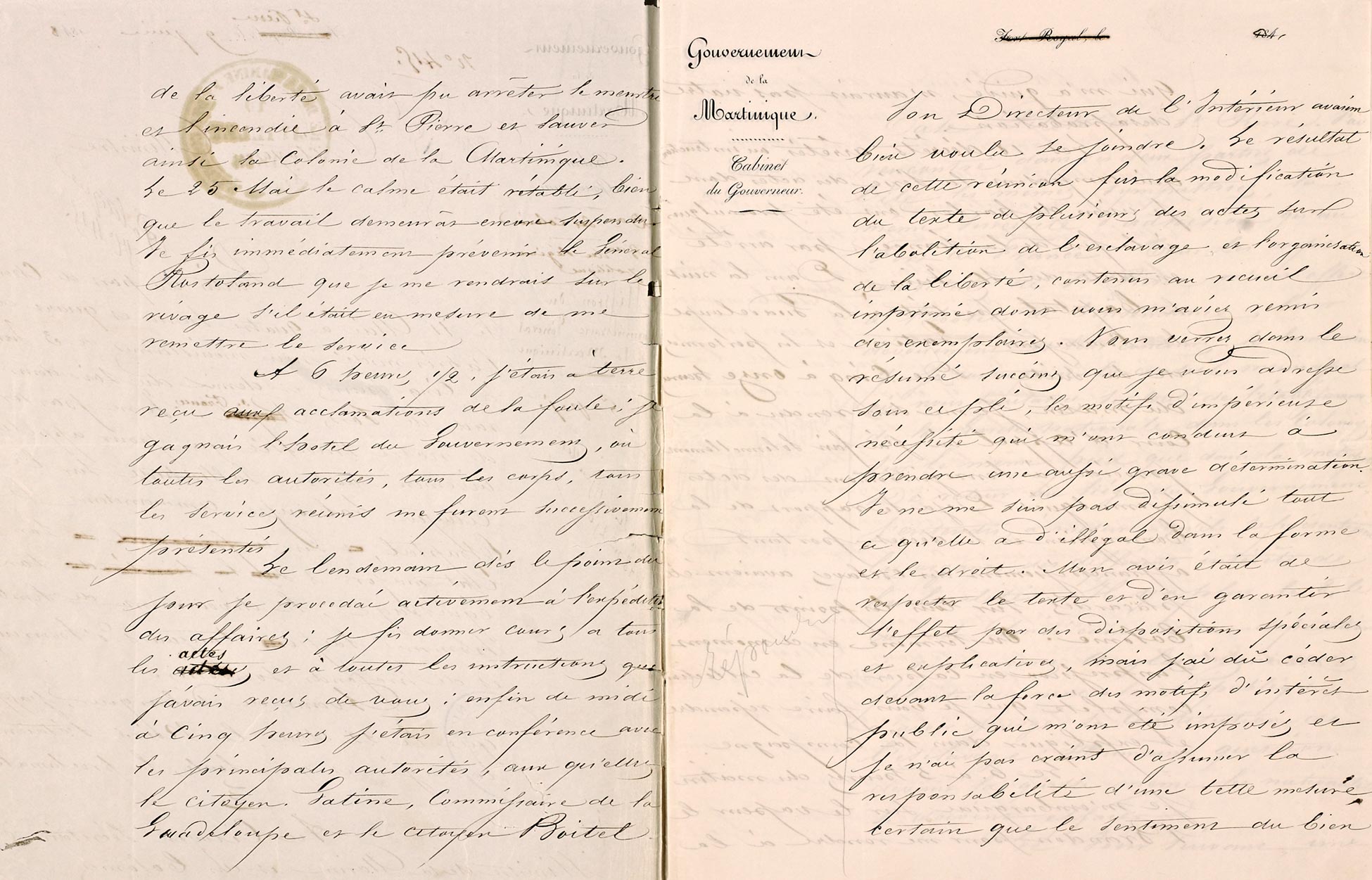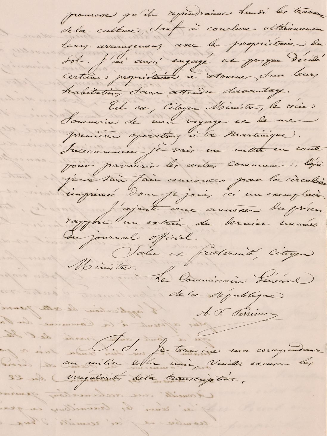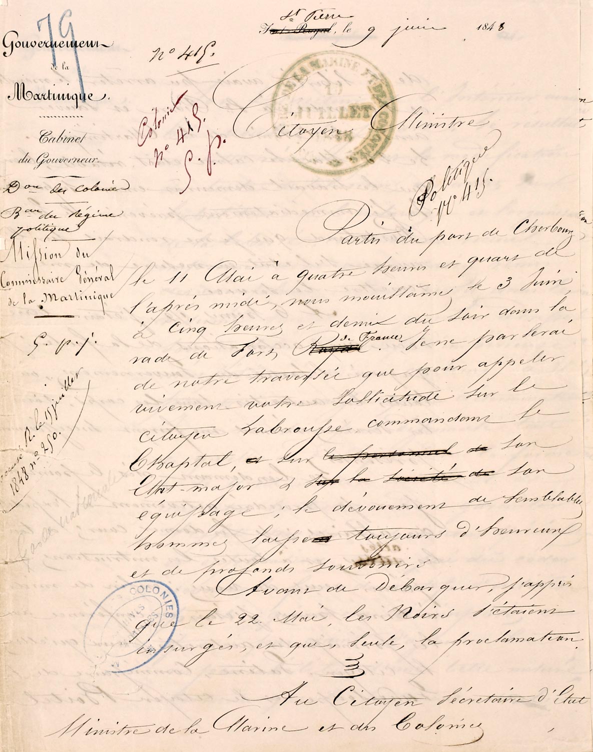 Première lettre du commissaire général de la République de la Martinique A.F. Perrinon, 9 juin 1848.