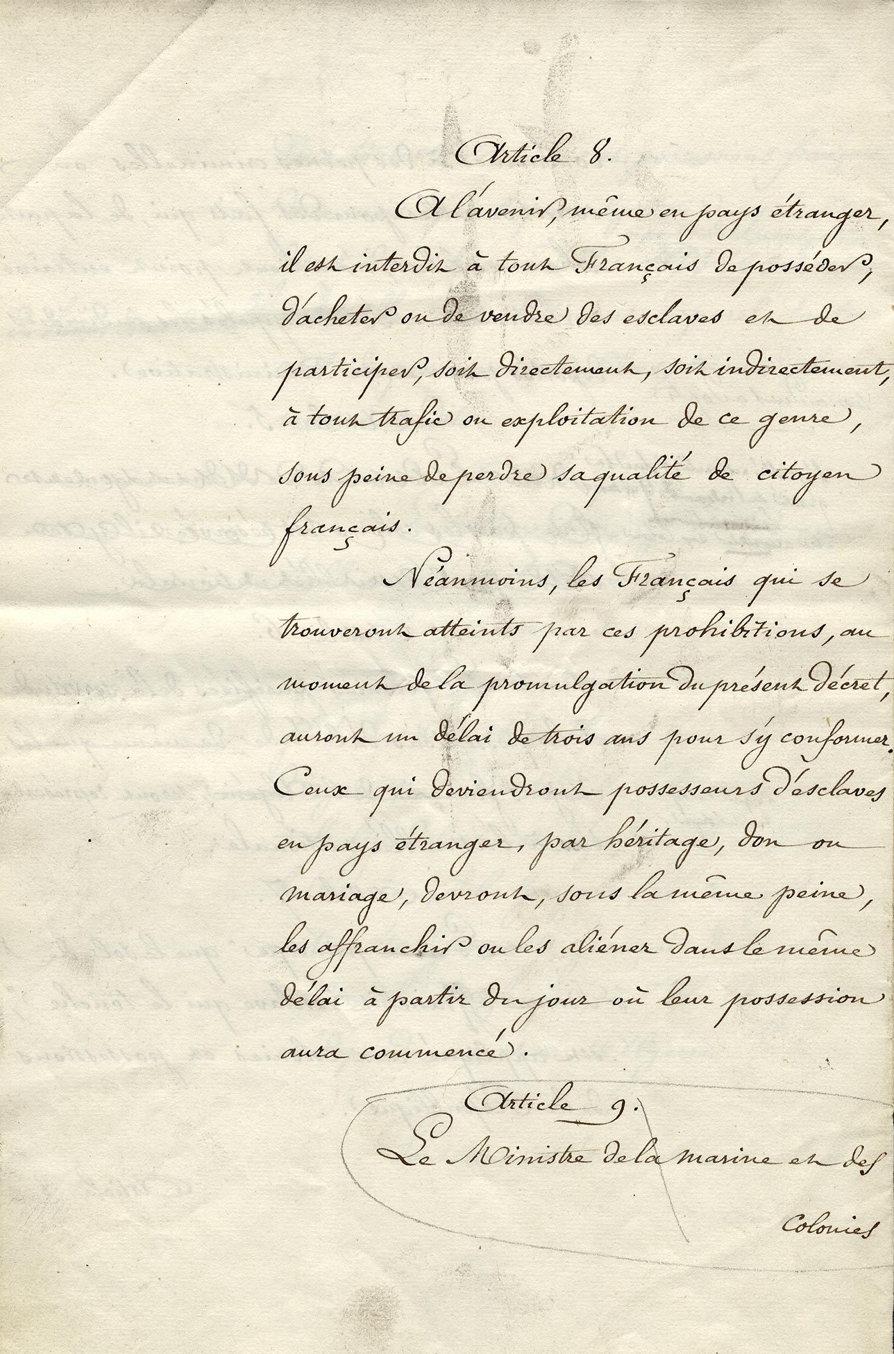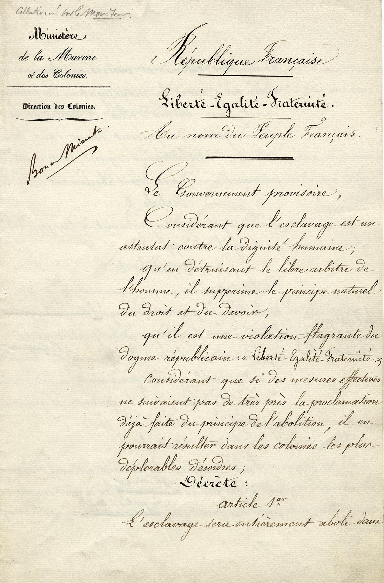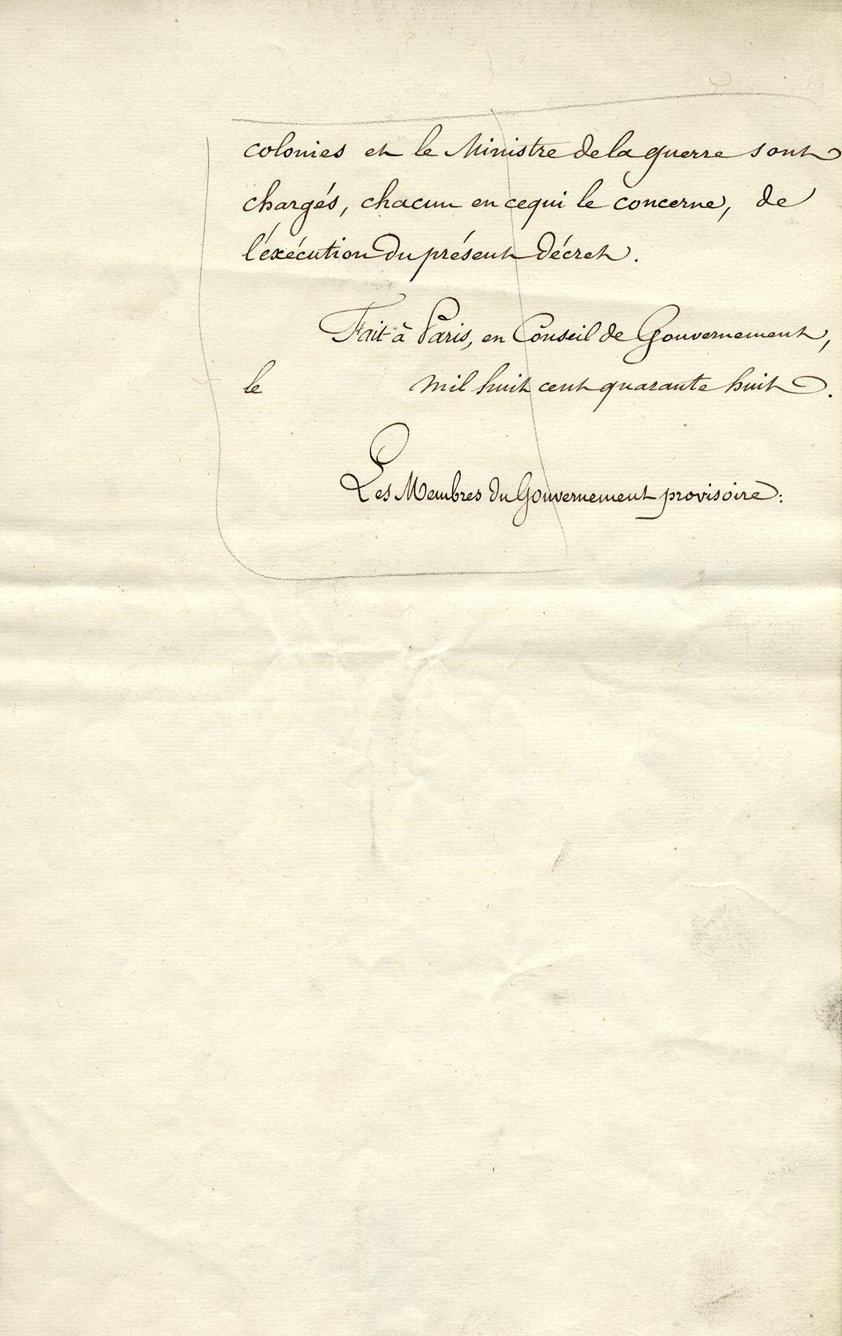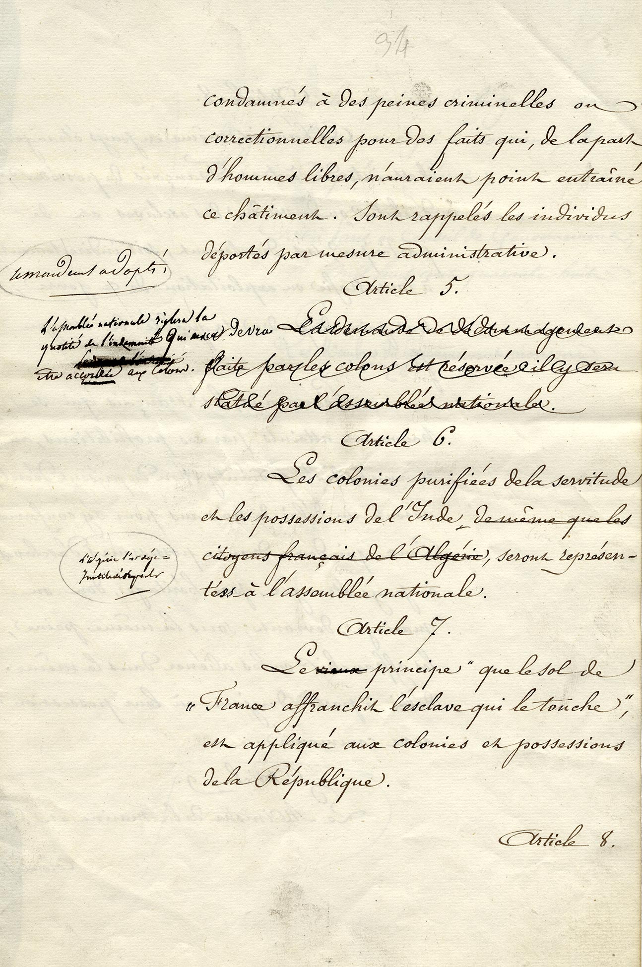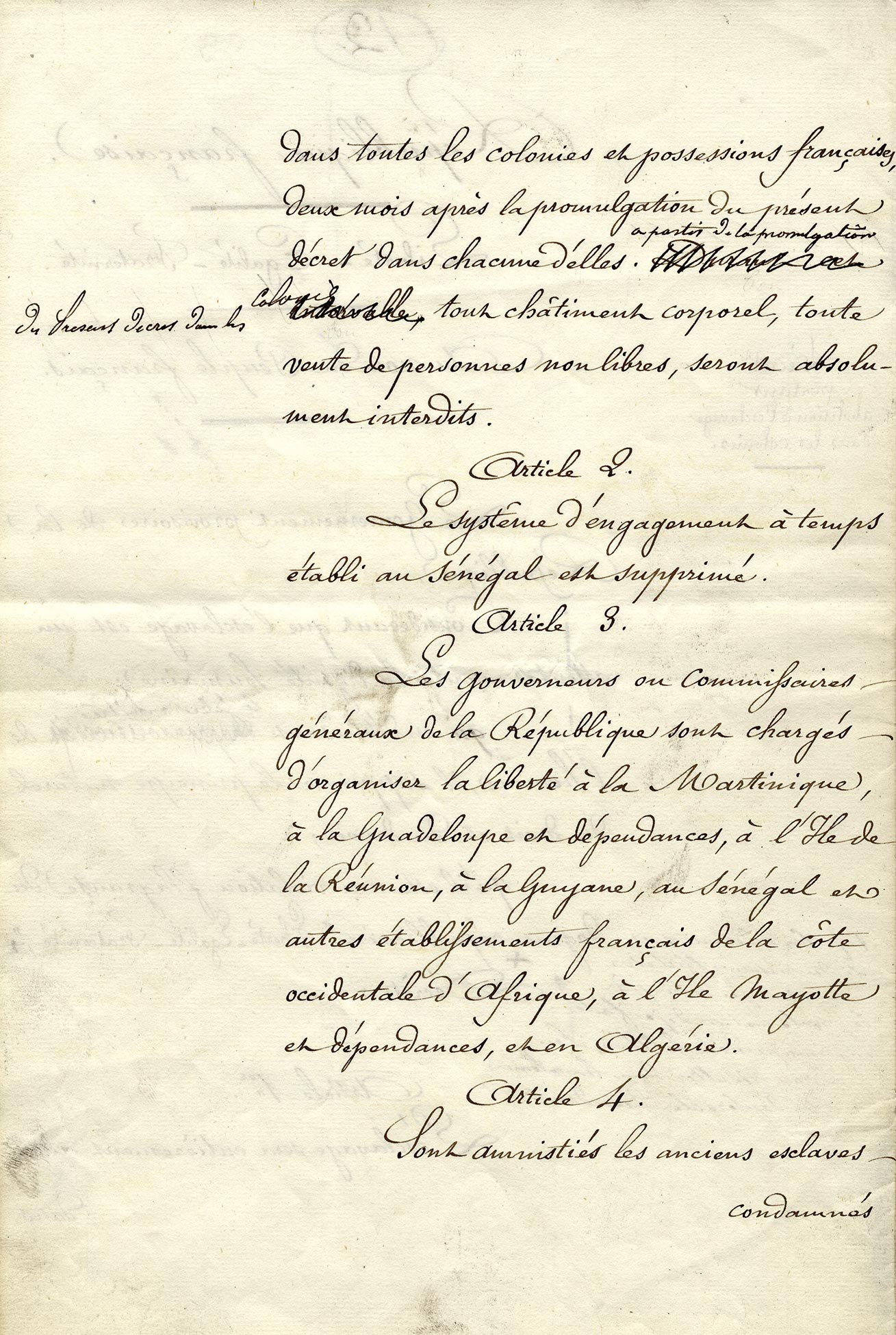 Minute du décret d’abolition avec correction de Schœlcher en marge.