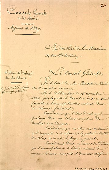 « Il s’agit de savoir combien de temps 200 000 nègres français pourraient rester esclaves au milieu de 900 000 nègres anglais déclarés libres ? Combien de temps, dans un archipel où les îles sont presque en vue les unes des autres, la population sera dans les unes, dotée des bienfaits de la famille, de la propriété et de la liberté, et dans les autres sera soumise à un esclavage qui, jusqu’à présent, n’a subi que de très légères modifications ? ».